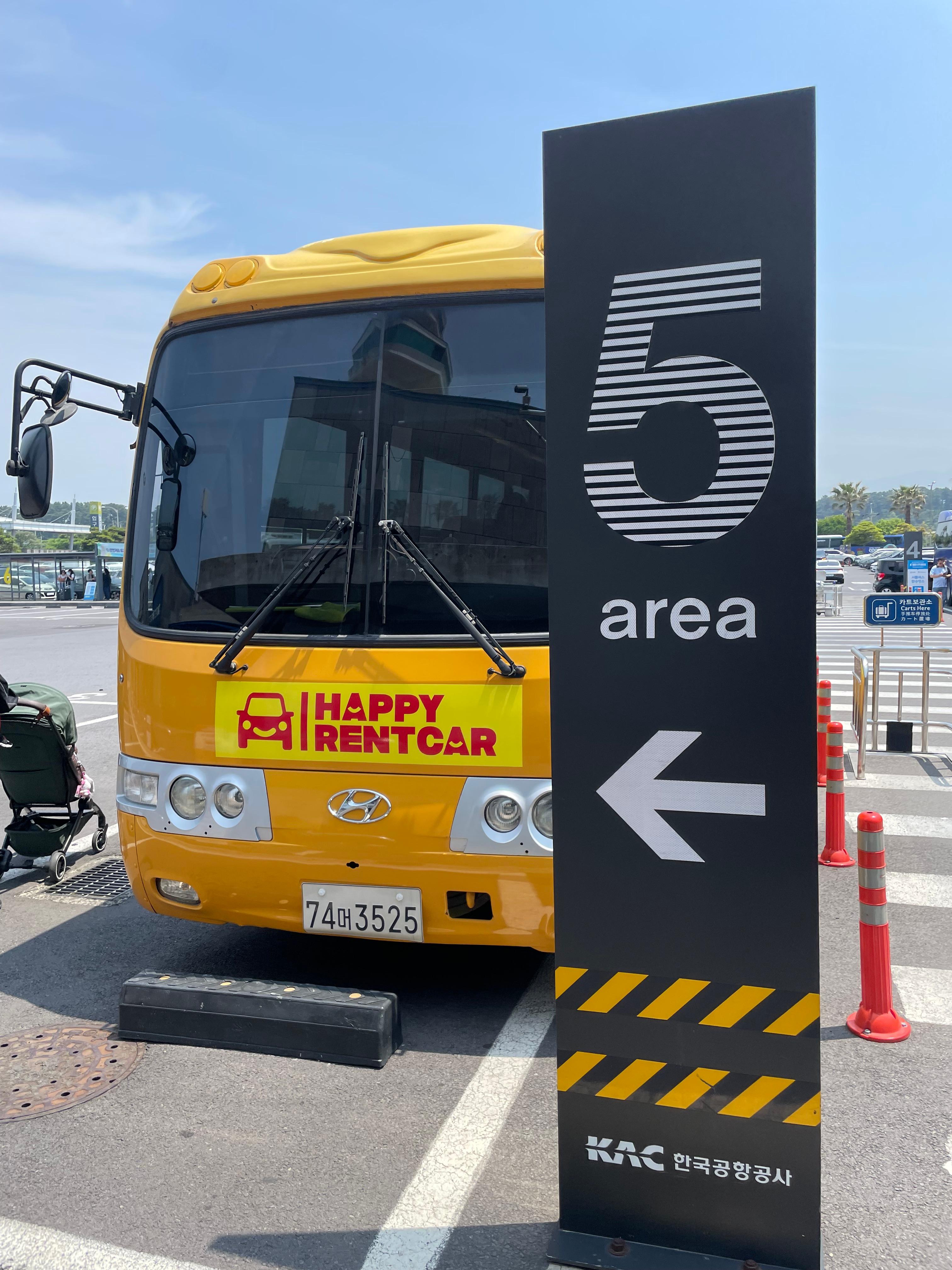 제주공항에 도착 후 렌트카 셔틀버스 탑승 구역으로 가시면, 5구역 1번에 해피렌트카의 노란 셔틀버스를 만날 수 있습니다.