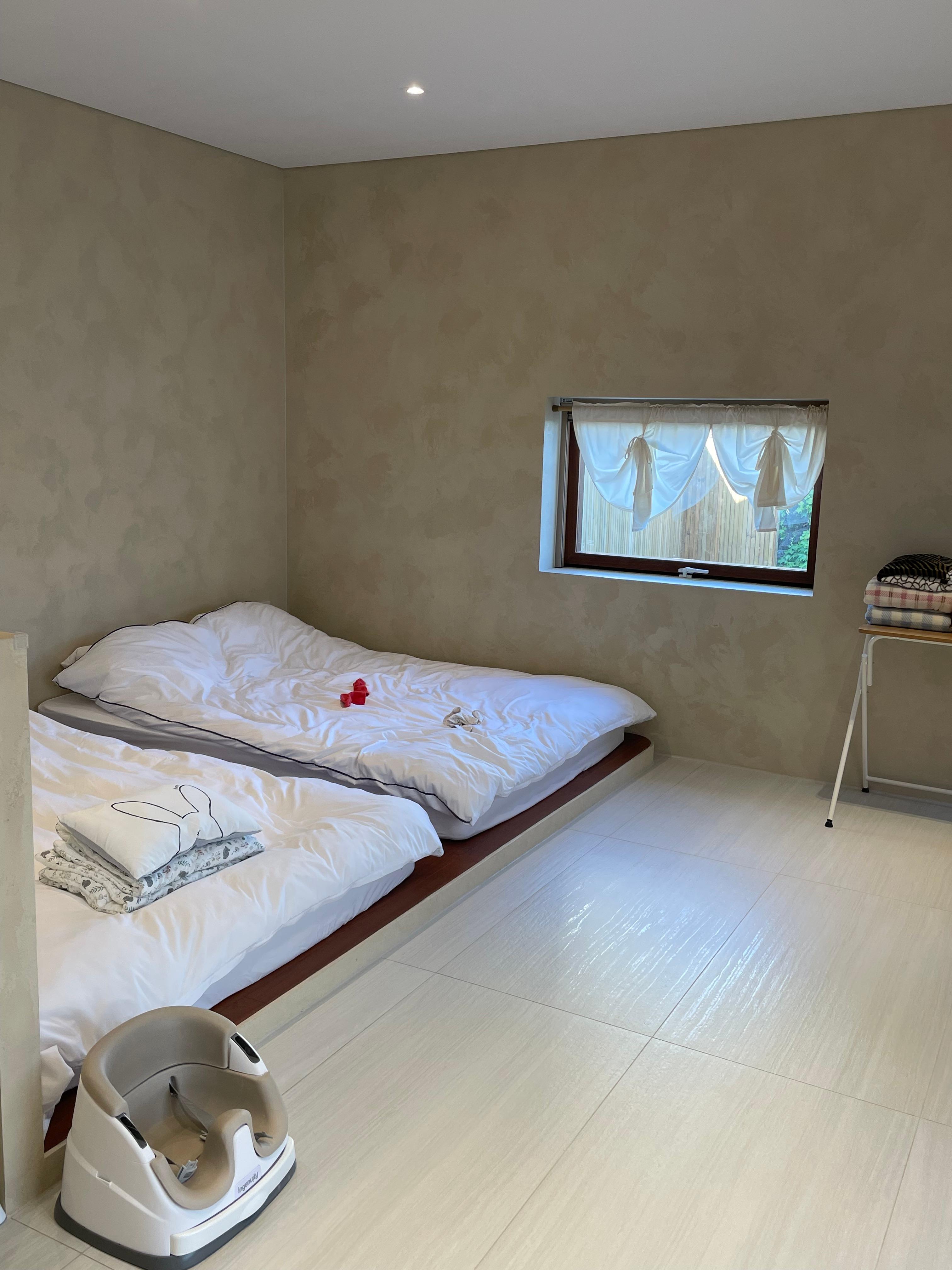침실에는 큰 매트리스 2개가 놓여져 있고, 침대가 높지않아 아기와 안전하게 함께 잘 수 있어서 좋았습니다.