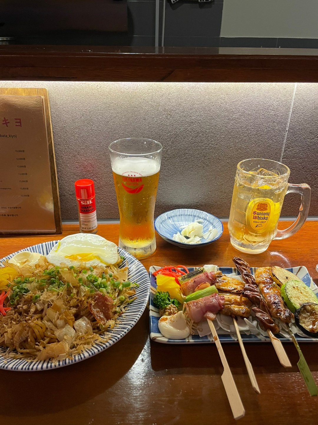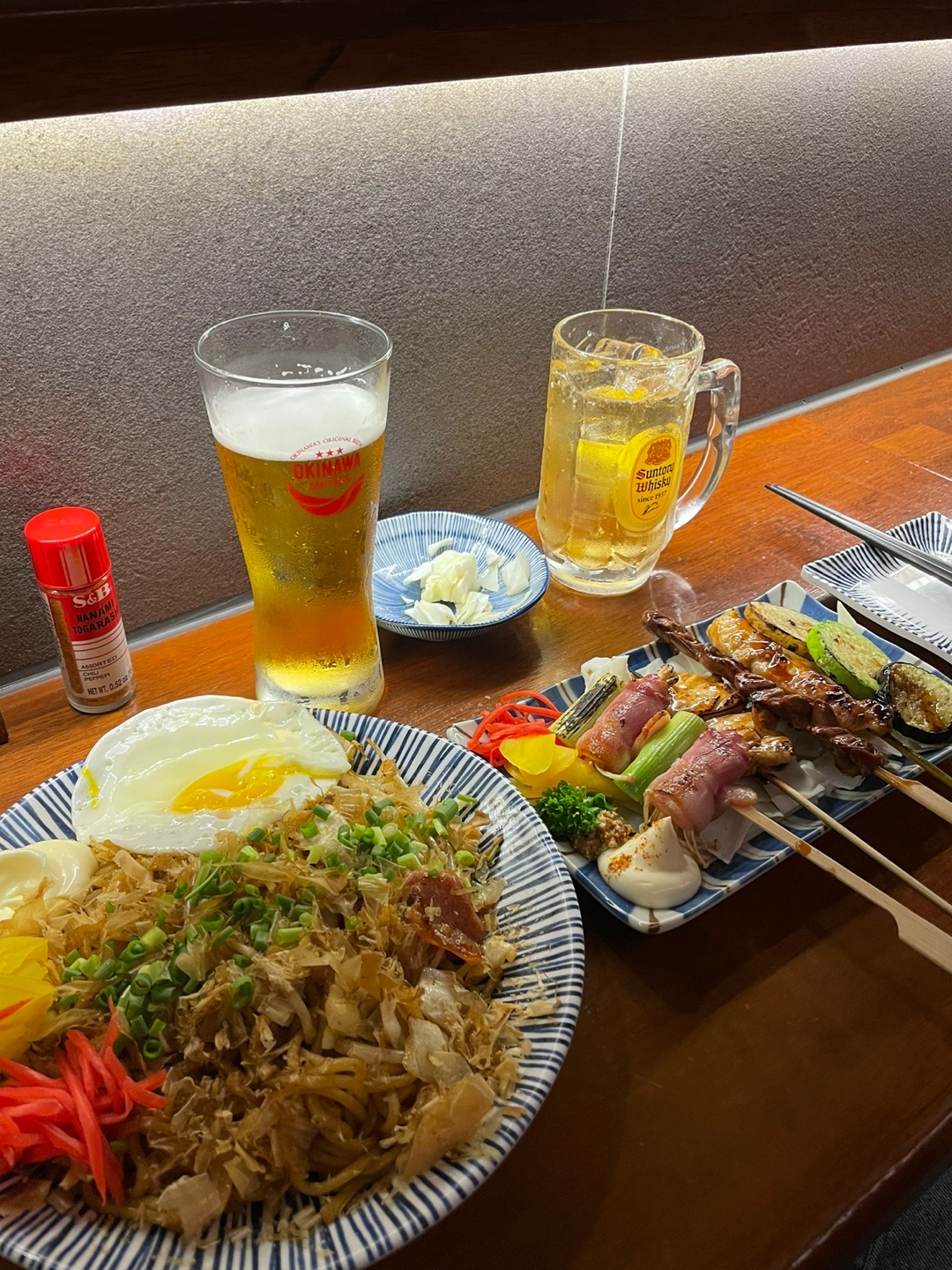 메인메뉴는 야끼소바와 야키토리4종을, 주류는 산토리하이볼과 오키나와 생맥주를 주문했습니다.