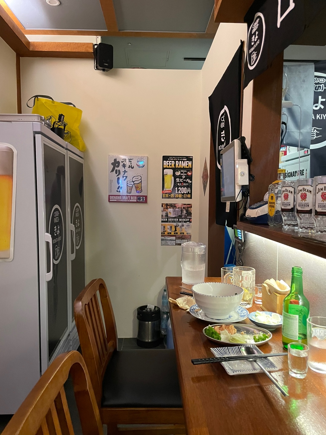 옛날방식의 철제 유리문을 열고 들어가면 마주하는 로바타키요의 내부 모습입니다. 내부는 생각보다 좁아서 많은 인원이 가기에는 제한이 있어 보였습니다. 맥주상자를 쌓아올린 테이블 약 3개와 바 형식의 긴 테이블의 자리가 준비되어 있습니다.