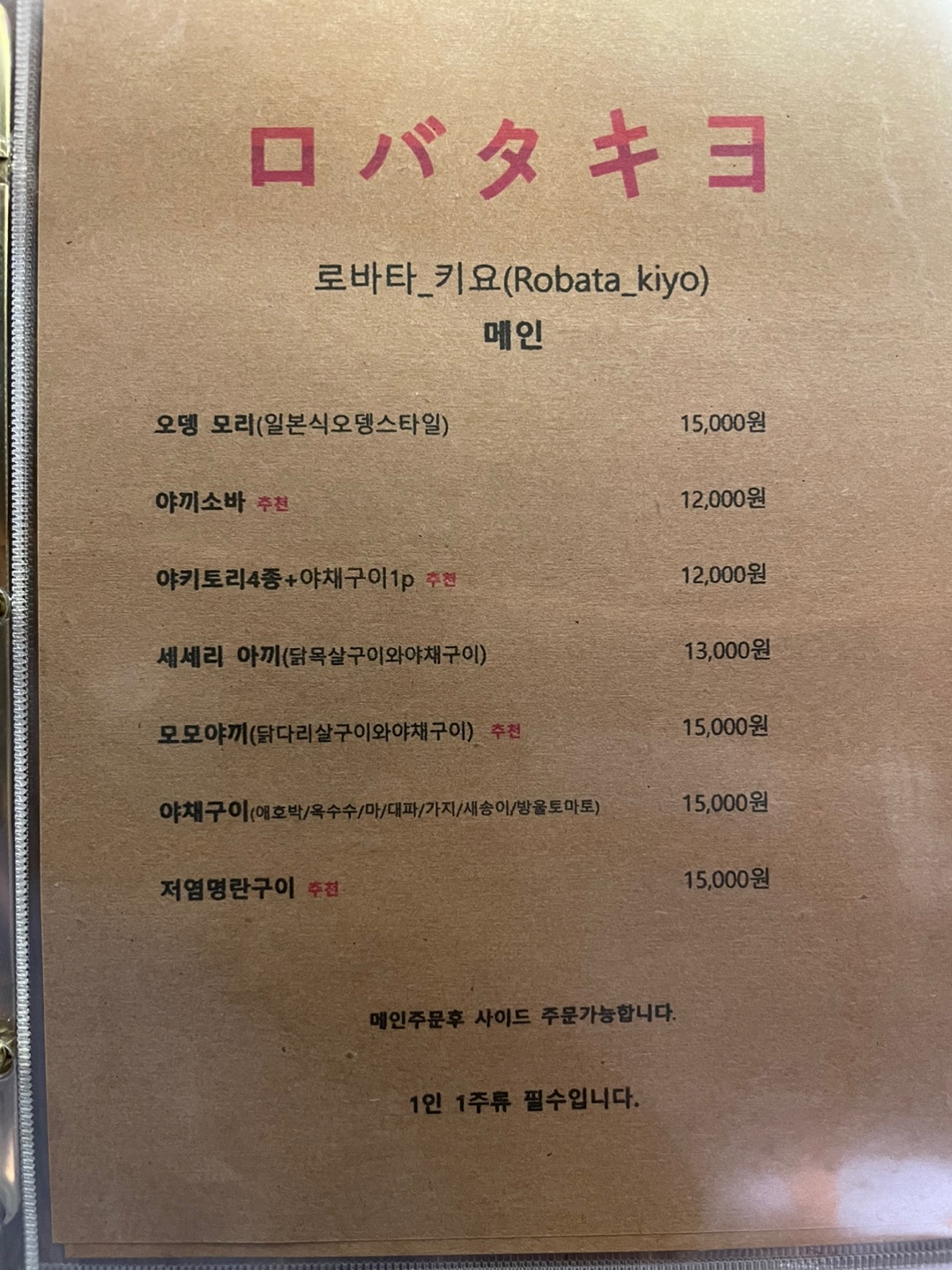 대신 일반적인 이자카야 대비 가격대가 매우 저렴하게 느껴집니다. 요즘은 이자카야 가서 메인 메뉴 2가지만 시켜도 조금 부담스러운데 로바타키요에서는 메인 메뉴가 2만원이 채 되지 않습니다. 물론 메뉴 구성이 다양하지 않다 보니 해산물을 좋아하시는 분들은 고를 만한 메뉴가 없어 보일 수도 있습니다. 하지만 아직은 오픈 초창기니까 점점 메뉴가 늘어나지 않을까 기대해봅니다.(혼자만의 생각..)