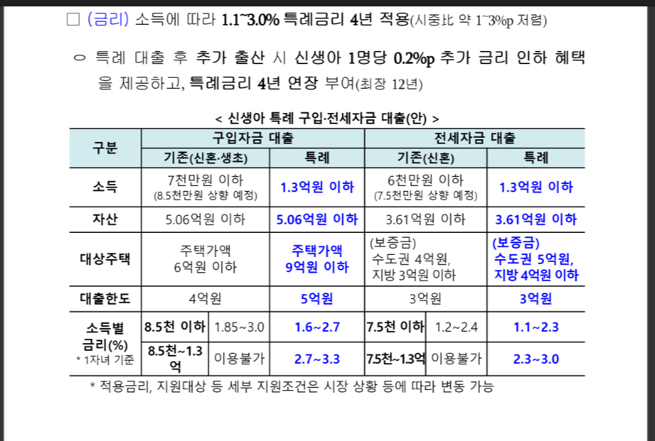 *특례금리는 4년간만 적용. 단, 특례대출 후 추가 출산시 신생아 1명당 0.2% 추가 금리 인하 혜택을 제공하고, 특례금리 4년 연장 부여(최장 12년 가능)