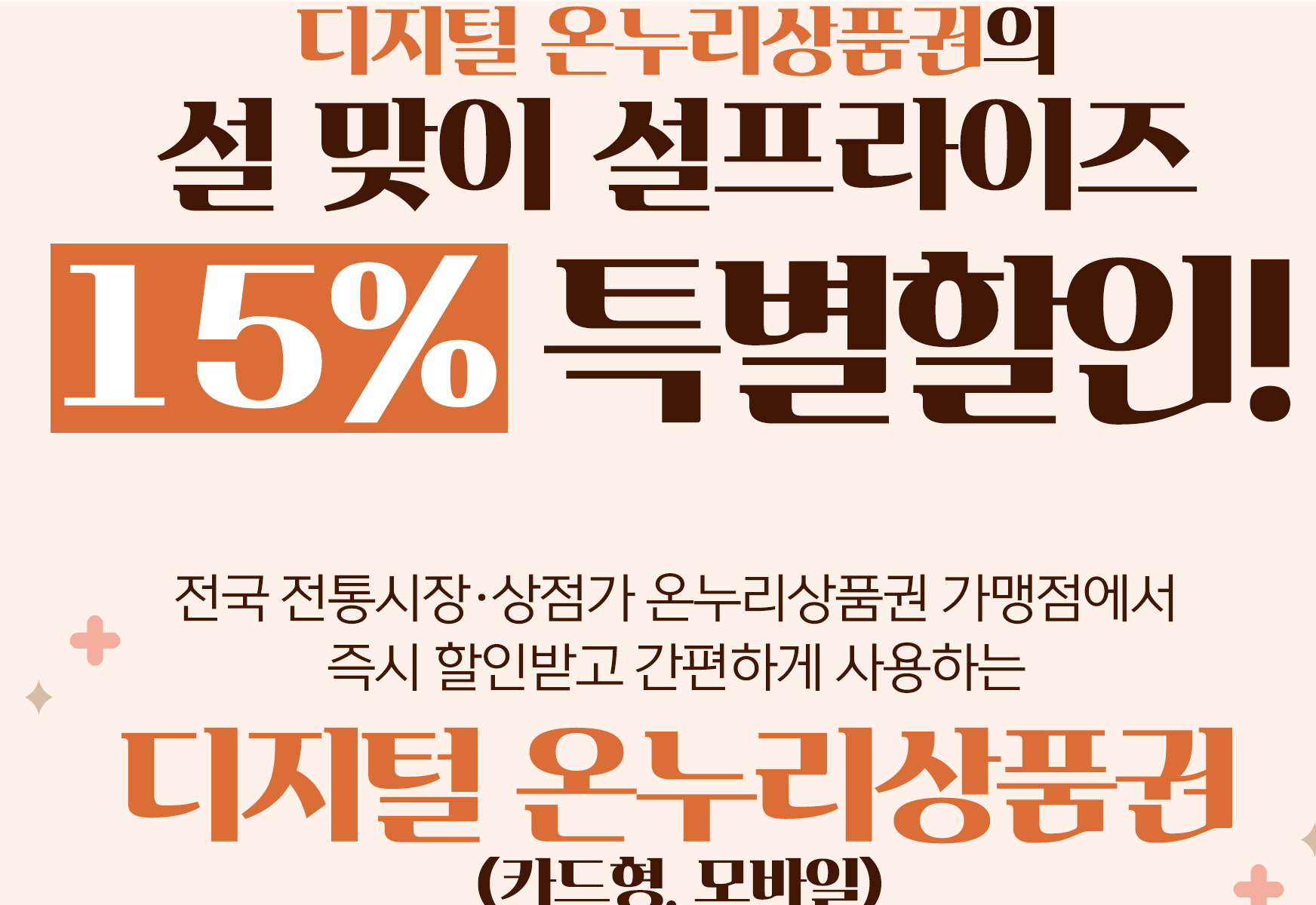 ‼️25.01.10~25.02.10 기간동안 카드형 온누리 상품권의 할인율이 5% 더 상향되어 총 15%의 할인혜택을 받을 수 있습니다‼️