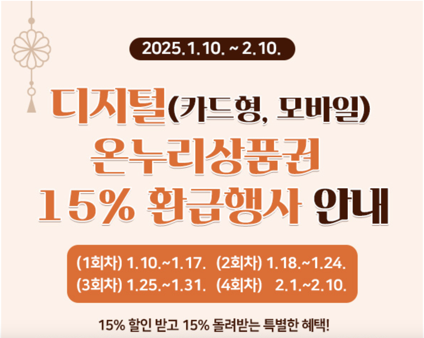 ⏹️ 행사기간 동안 디지털(카드형, 모바일)온누리 상품권 이용하여 구매시, 15%환급 적용