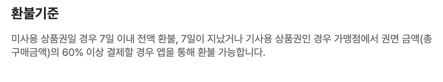 ⏹️가맹점에서 권면 금액의 60%이상 구매할 경우 나머지 잔액을 현금으로 돌려 받을 수 있습니다.
