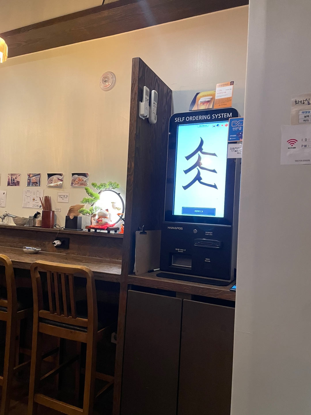 가게 내부에 들어서면 바로 앞에 주문 키오스크가 위치하고 있습니다. '솟구쳐차기'의 주문은 입구 키오스크에서 주문 및 결제까지 진행하시고 자리에 앉으시면 됩니다. 메뉴는 간소하게 5가지만 준비되어 있습니다. 메인 메뉴인 라멘은 돈코츠라멘, 매운미소라멘 2가지이고, 사이드로 치킨가라아게와 감자고로케, 새우튀김을 주문하실 수 있습니다. 메인 메뉴가 2개밖에 없으니 오히려 더 맛에 신뢰가 가는 느낌이었네요.