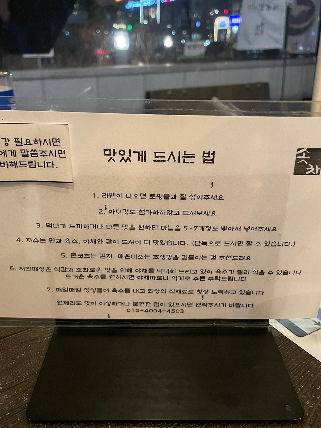 주문을 하고 테이블에 앉으면 라멘 맛있게 먹는 법이 테이블 마다 적혀 있습니다. 음식이 나오기 전 위 방법을 꼭 정독해보시고 순서대로 따라해보시길 바랍니다. 저도 예전에는 식당마다 설명되어 있는 방법을 무시하고 마음대로 먹었었는데, 어느 순간부터 식당의 안내 대로 먹어보니 정말 다양한 맛을 느낄 수 있고 음식을 더 맛있게 먹을 수 있더라구요. 이후부터는 꼭 '맛있게 먹는 법'대로 따라 먹습니다.