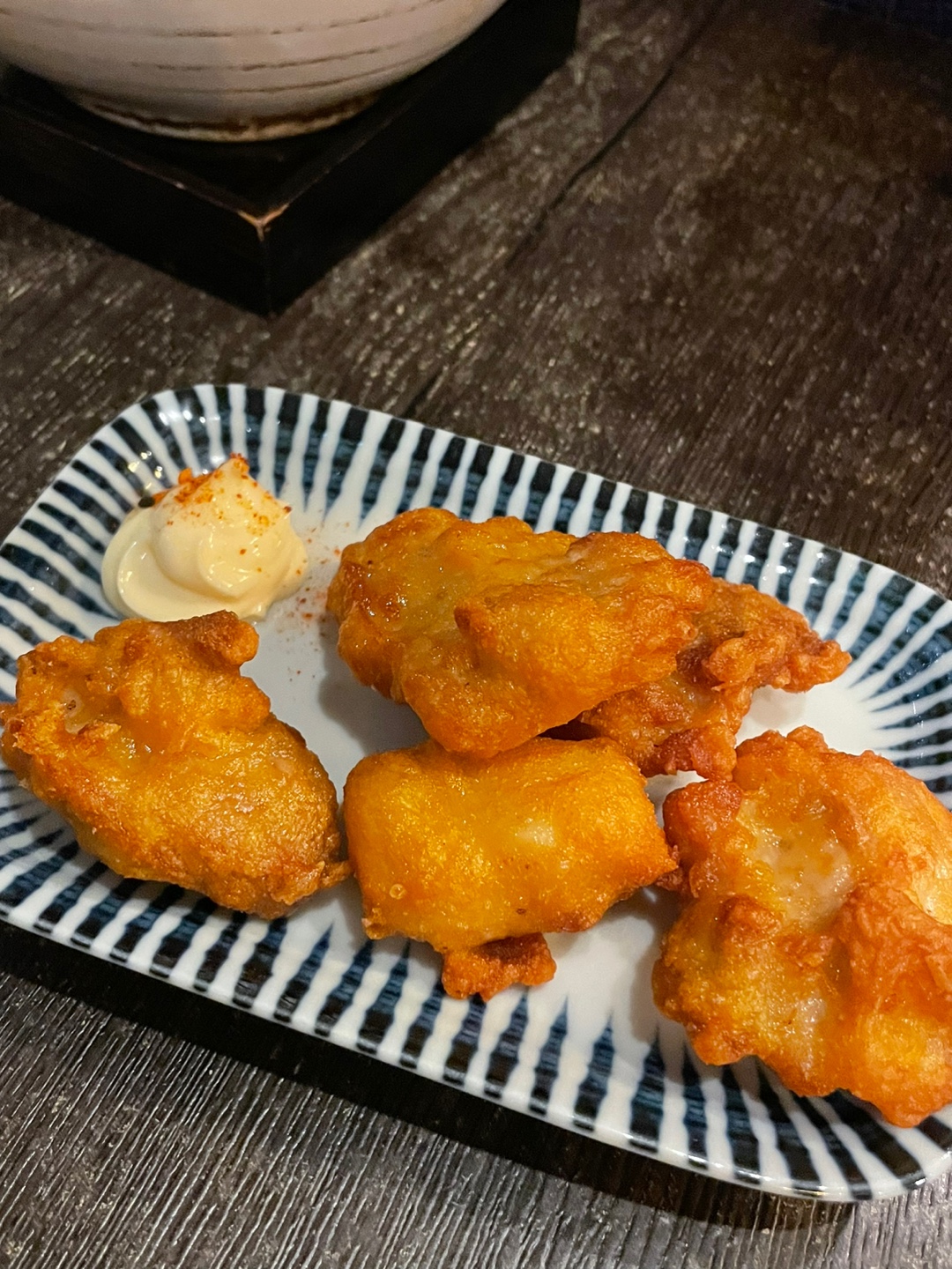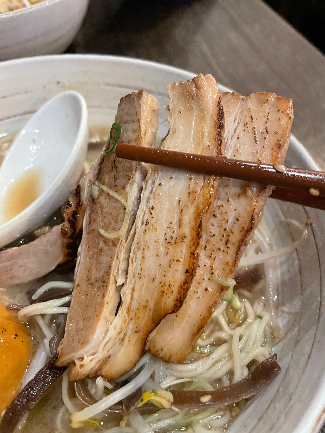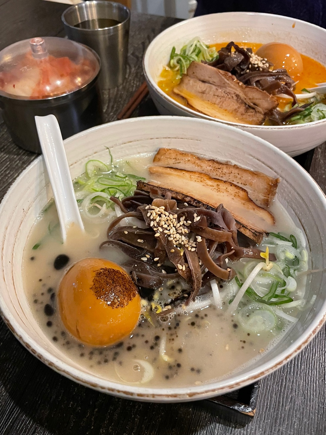 조금 기다리다 보니 주문한 음식이 나왔습니다. 저희는 돈코츠라멘(10.0)과 매운미소라멘(11.0), 그리고 치킨가라아게 5pcs(5.0)를 주문했습니다. 여러 후기들을 보니 '솟구쳐차기'의 시그니처 메뉴는 돼지뼈육수로 만든 돈코츠라멘인 것 같더라구요. 돈코츠라멘을 2개 시킬까 하다가 매운 미소라멘도 너무 궁금해서 다르게 주문해봤습니다. 주문할때 두 메뉴 모두 염도를 보통으로 했는데 다른 라멘 가게 보다는 확실히 짠맛이 덜 해서 좋았습니다. 혹시 짠 맛을 즐기신다면 염도를 올리시는 것을 추천 드립니다. 두 라멘 모두 내용물은 동일하고 육수만 다른 것 같습니다. 돈코츠라멘은 돼지 육수의 깊고 부드러운 맛이 정말 일품이었고, 매운 미소라멘은 매콤하게 맛있긴하나 개인적으론 돈코츠라멘이 더 맛있게 느껴졌습니다. 치킨가라아게도 겉바속촉으로 정말 잘 튀겨져서 소스와 함께 먹으니 아주 맛있게 즐길 수 있었습니다.