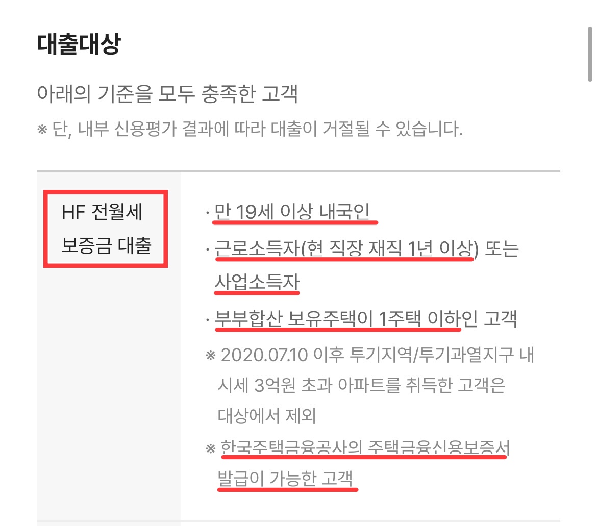 -HF(한국주택금융공사) 전세대출: 만 19세 이상의 내국인만 신청가능하며, 근로소득자(현직장 재직기간 1년이상) 또는 사업소득자만 신청할 수 있습니다. 또한 부부합산 보유주택수가 1주택 이하인 고객만 신청 가능합니다.