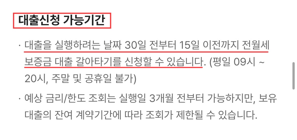 대출신청 후 심사가 완료되어 갈아타기 실행을 하는 경우에는 평일 09시~16시 사이에 꼭 실행을 하셔야 합니다. 16시 이전에 실행을 못하는 경우에는 실행일을 변경하여야 합니다. 또한 기존 대출의 원리금 납부일에는 대출 실행을 할 수 없으며, 갈아타기 실행 당일 전세 계약 기간이 절반 이상 남아있어야 합니다.
