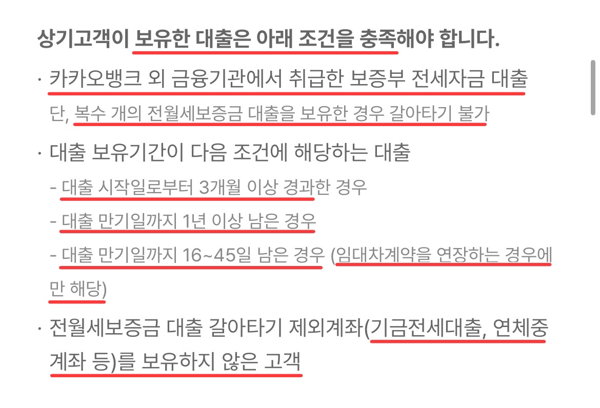 -카카오뱅크 외 금융기관에서 취급한 보증부 전세대출(단, 전세대출을 여러개 보유한 경우 갈아타기 불가)
