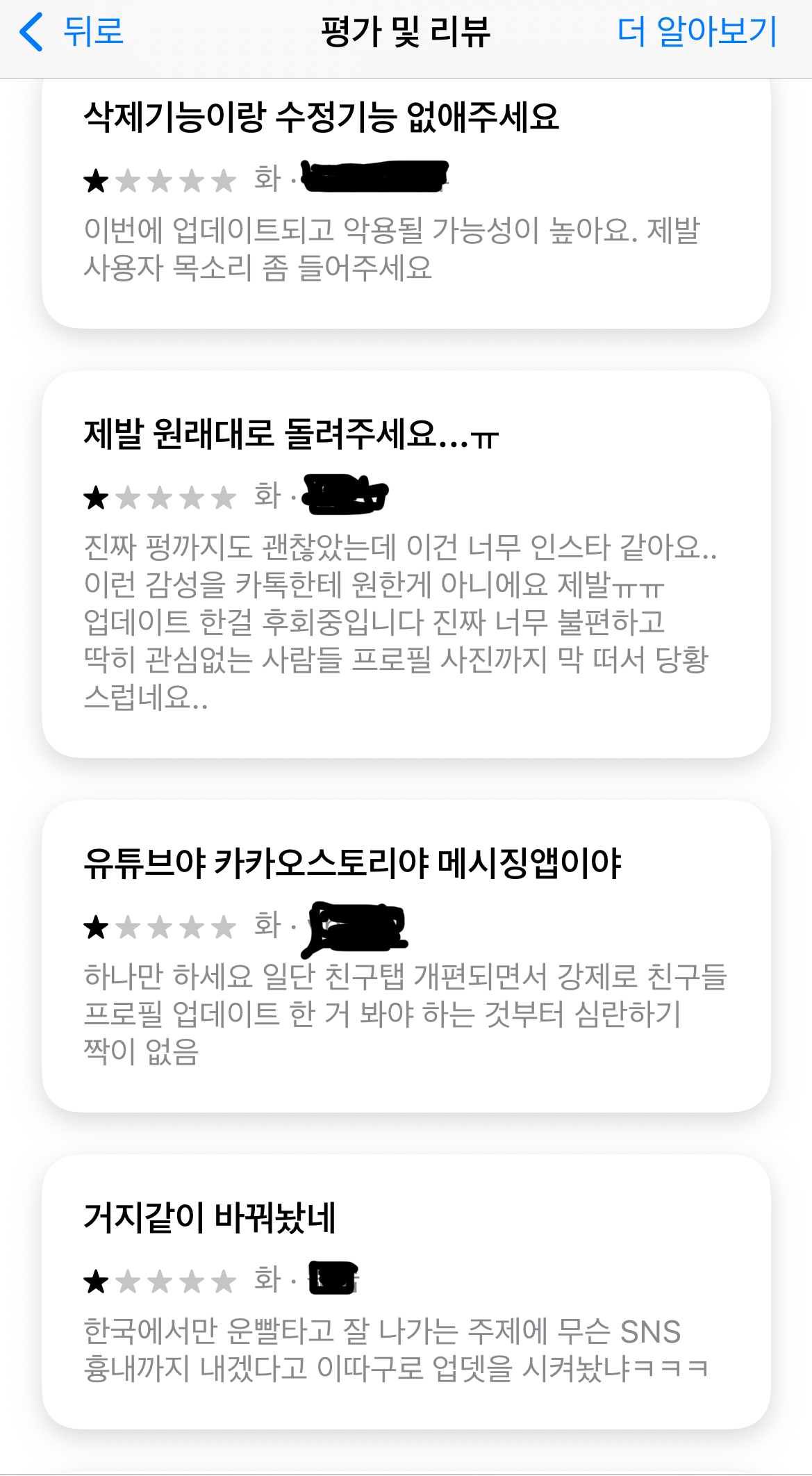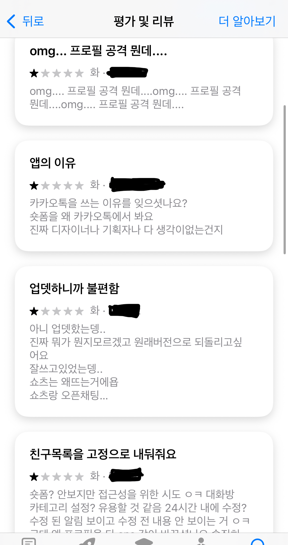 앱 스토어 최근 리뷰를 보면, 대부분이 별 1개의 후기들입니다. 역시나 많은 사람들이 친구목록에서 보여지는 사진, 숏폼 시청 기능 등에 불만이 많이 있네요.