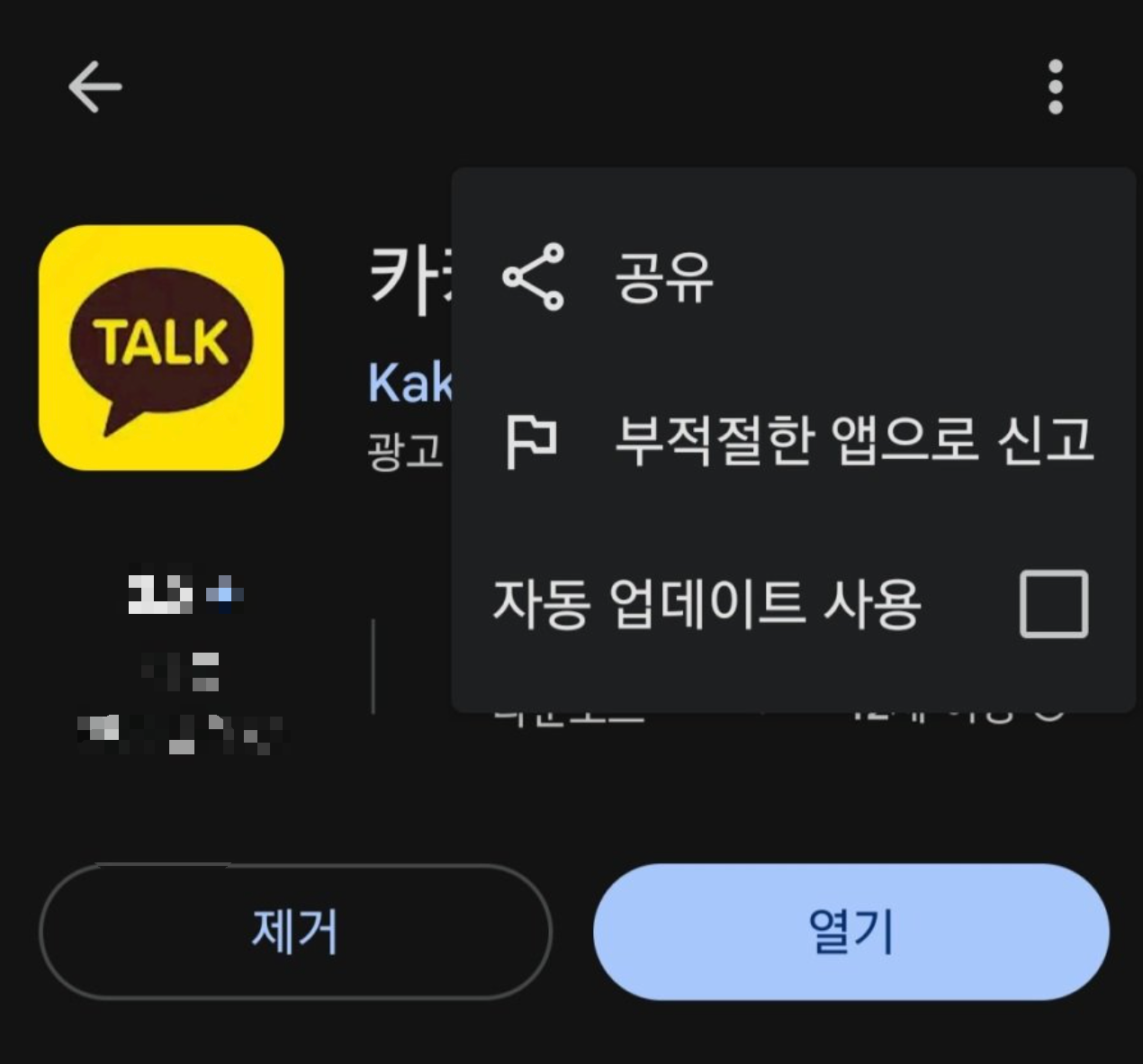 📌 구글 플레이스토어 실행 -> 검색창에 '카카오톡'검색 -> 우측 상단 점 세개 클릭 -> 자동 업데이트 사용 체크박스 해제