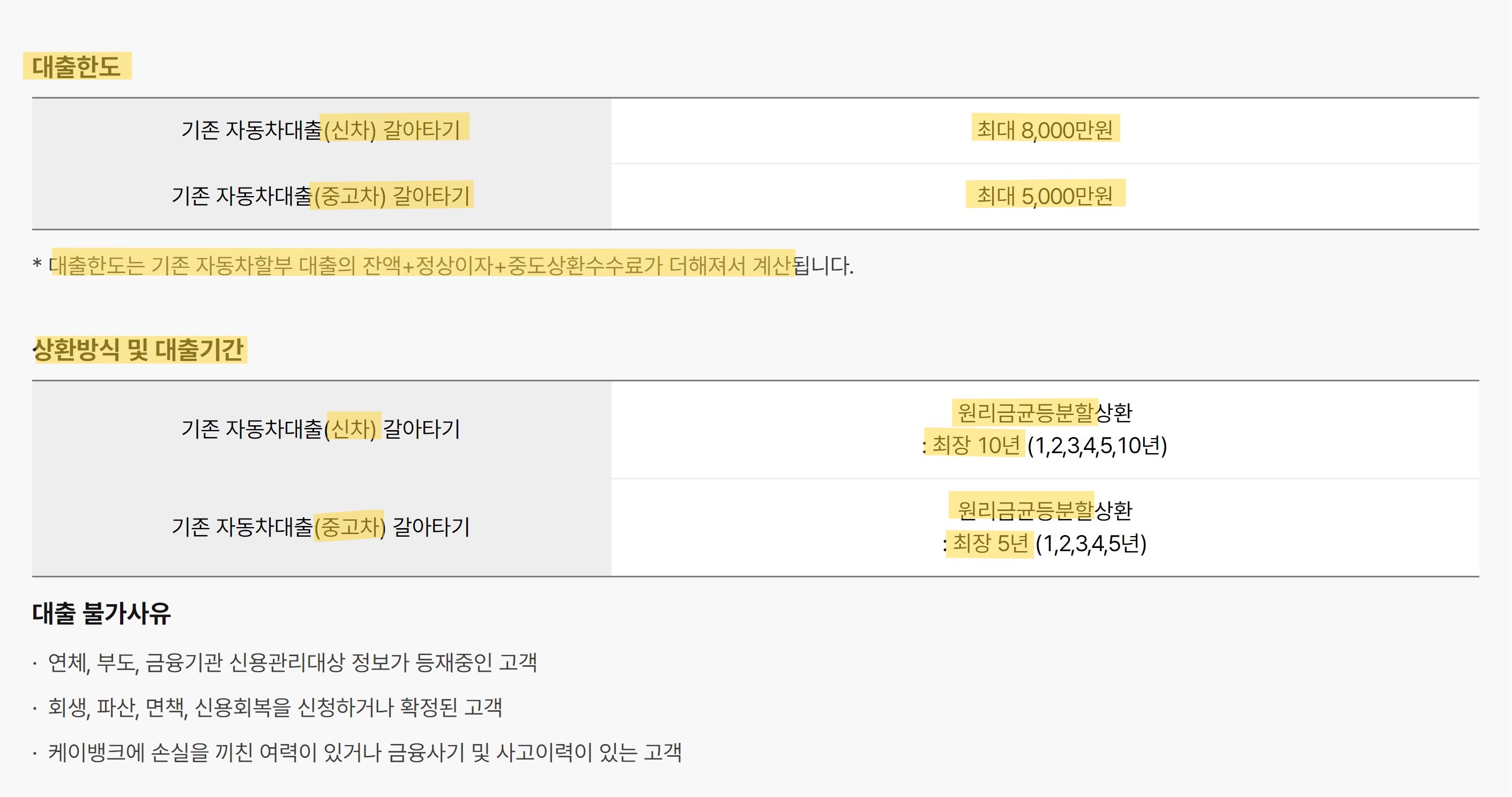 위에서 본 것처럼 대출한도 부분에서도 기존 대출이 '신차 구입용'인지 '중고차 구입용'인지에 따라 차이가 발생합니다. 신차대출을 갈아타는 경우에는 최대 8,000만원 이내, 중고차대출을 갈아타는 경우에는 최대 5,000만원 이내까지 이용 가능합니다. 단, 중요한 것은 케이뱅크의 자동차대출 한도는 기존 자동차 대출의 [잔액+이자+중도수수료]를 합산한 금액 이내까지만 산출됩니다. 대환대출 용도이기 때문에 '실제 소요자금'을 초과하는 부분은 추가대출이 불가합니다.