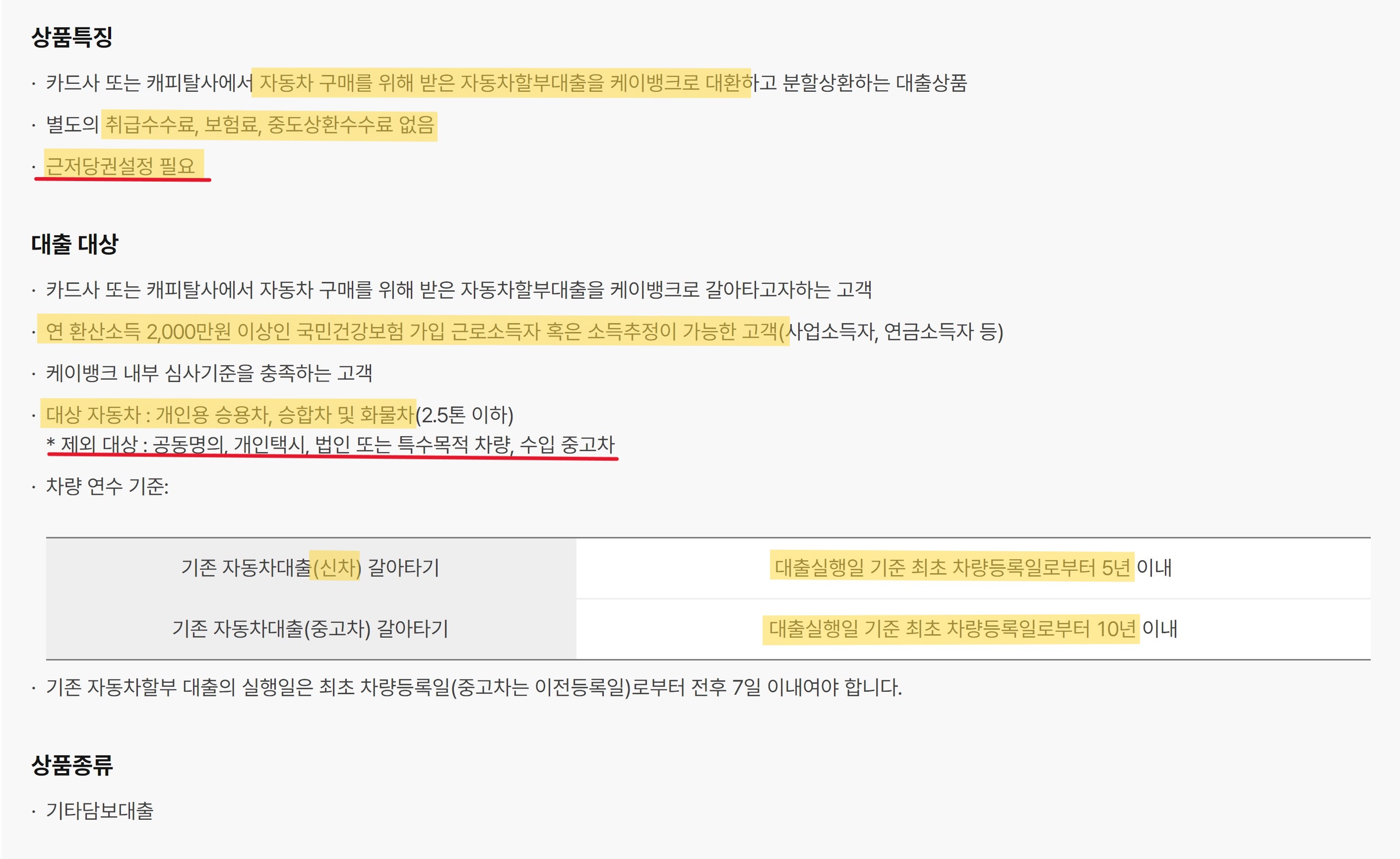 케이뱅크의 자동차대출은 2금융권(캐피탈/카드사)에서 '구매목적'으로 받았던 자동차대출만 대환 신청이 가능합니다. 간혹 2금융권에서는 보유중인 자동차를 담보로 생활안정자금 대출을 진행하는 경우도 있는데, 이런 경우에는 대상자가 되지 않습니다. 대출을 진행함에 있어 별도의 보증보험료나 수수료 등이 발생하지 않으며, 중도상환수수료도 면제되는 상품이니 실행 후 여유자금이 생길때마다 갚아나가기에도 용이합니다. 시중은행과의 대출방식에 차이점이 있는데, 시중은행의 자동차대출은 서울보증보험의 대출보증서를 담보로 진행이 되는 반면 케이뱅크의 자동차대출은 차량에 근저당권을 설정하는 방식으로 대출이 진행되는 것으로 보입니다.