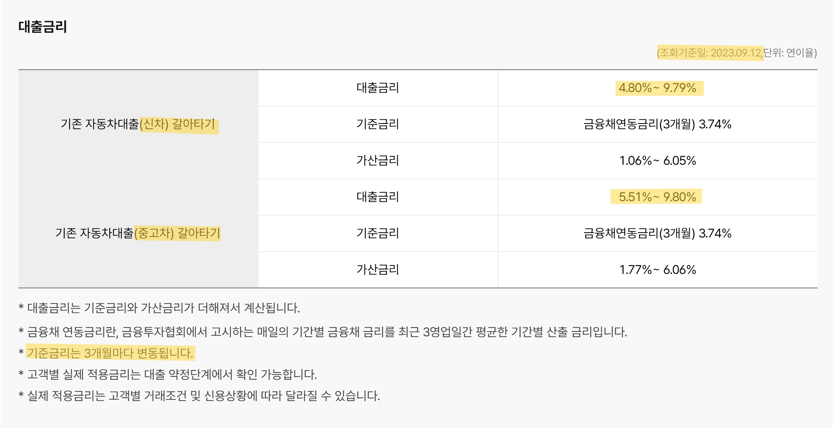 기준금리는 3개월 변동금리로 적용 되며, 고정금리 또는 6개월 변동금리는 선택하실 수 없습니다. 최저금리 수준이 아주 낮은 편은 아니지만, 최근 캐피탈/카드사 자동차할부 금리가 최소 7%에 육박하는 것을 감안하면 이자 비용을 꽤나 절약할 수 있을 것으로 보입니다.
