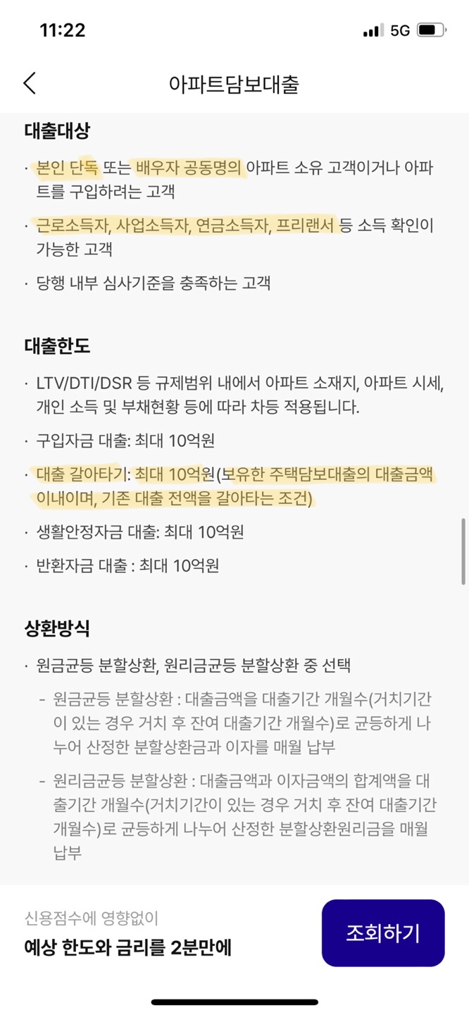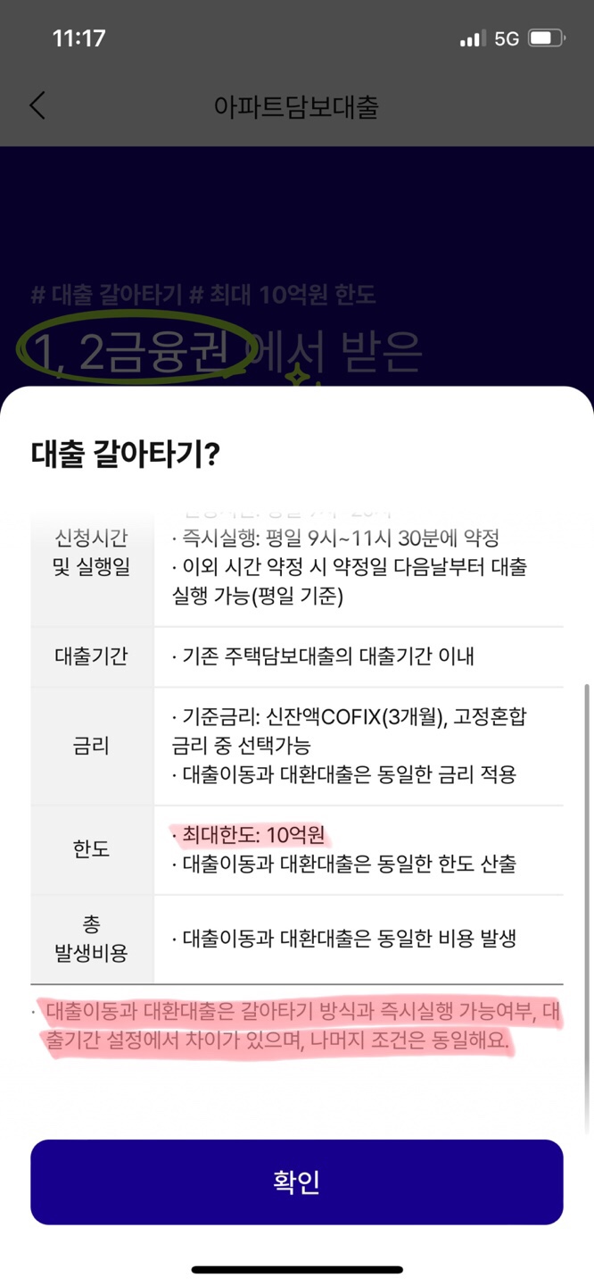 주담대 갈아타기(대출이동제)의 대출 한도는 최대 10억원 이내입니다. 단 기존 보유한 주택담보대출의 현재 잔액 이내까지만 대출을 받을 수 있으며, 혹시 dti, dsr때문에 한도가 적게 나오는 경우라도 본인 자금을 더해 기존 주담대를 전액 상환하는 조건입니다.