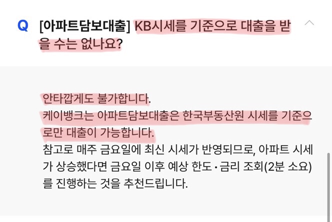 케이뱅크 주택담보대출의 아파트는 '한국 부동산원 시세'를 감정평가액으로 사용하여 대출한도를 산출합니다. 일반적으로 대부분의 금융기관에서 아파트를 평가할때 KB시세를 이용하는데 케이뱅크는 조금 특이하네요. 따라서 한국부동산원 시세가 제공되지 않는 아파트라면 대출 신청 자체가 불가하며, 혹시 KB시세가 더 높게 나와 KB시세로 대출 심사를 받고 싶더라도 불가합니다.