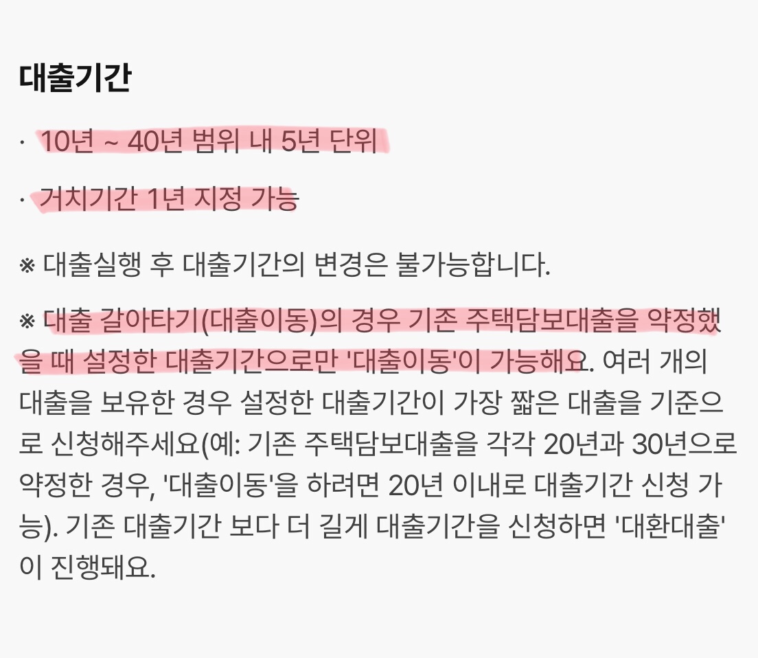 중요한 것은 갈아타기(대출이동제) 서비스를 이용하는 경우 기존 주택담보대출을 받을 때 설정했던 총 대출기간을 초과하여 설정할 수 없습니다. (ex. 기존에 우리은행에서 주택담보대출을 30년 상환기간을 설정하여 실행했고, 이번에 케이뱅크에서 갈아타기(대출이동제)를 통해 대환대출을 진행한다면 케이뱅크 주담대는 30년 이내로 대출기간을 약정할 수 있습니다.)