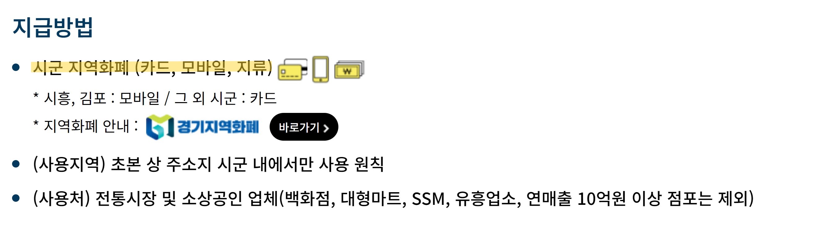 경기도 청년기본소득의 지원금은 현금지급이 아닌 거주지의 지역화폐로 지급됩니다. 현금지급이 아닌 부분은 조금 아쉬운 부분이나 지역화폐도 다양한 가맹점에서 사용할 수 있으니 유용하게 사용하시길 바랍니다. 지원금은 신청기간이 지난 이후 대상자로 선정되면 23.10.20일에 지급이 시작 될 예정입니다.