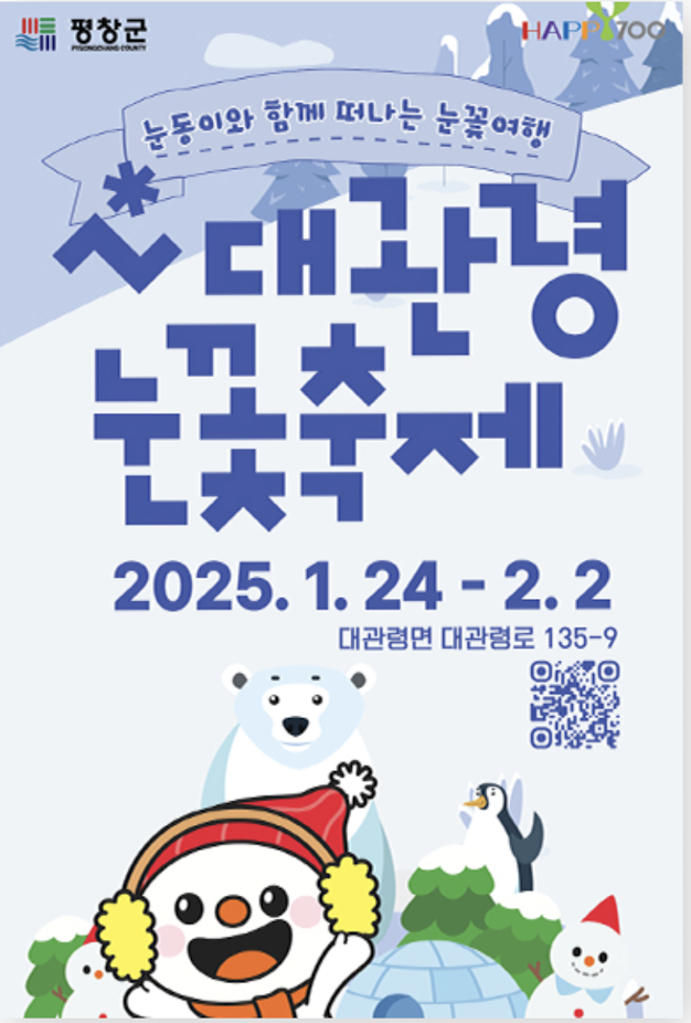 올해 2025 대관령 눈꽃축제는 평창군의 마스코트인 '눈동이'와 함께 평창군의 겨울을 즐기는 테마로 구성되었습니다.
