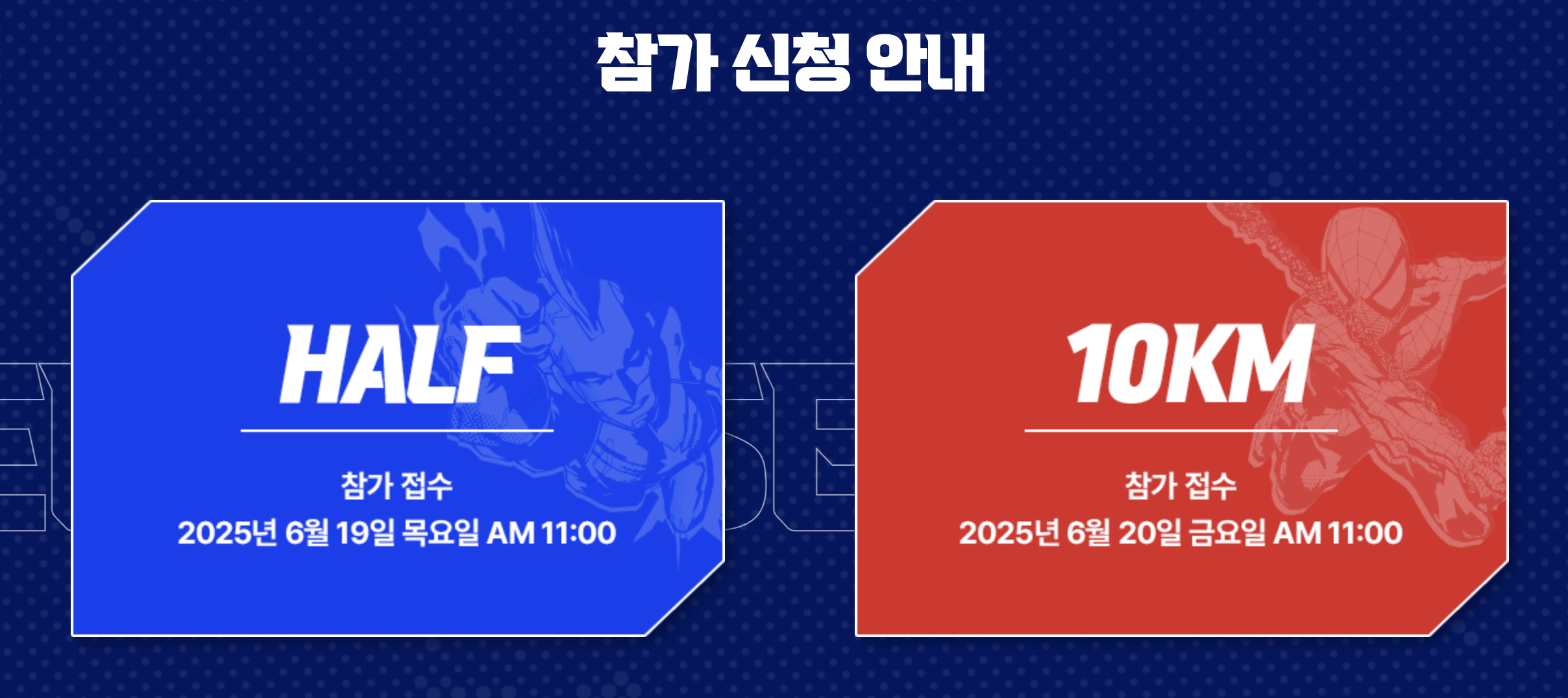 가장 인기가 많은 10k는 25.6.20(금) 오전 11시부터 신청이 시작되고, half마라톤은 25.6.19(목) 오전 11시부터 신청이 시작됩니다.