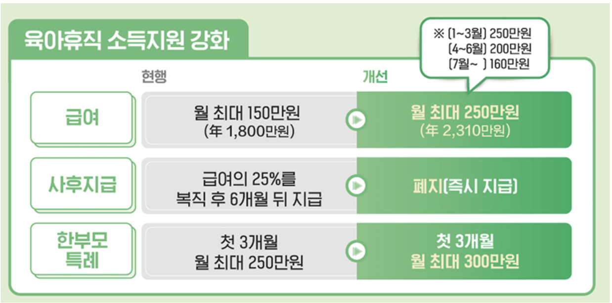 2024년 육아휴직급여 월 150만원 -> 2025년 육아휴직급여 월 최대 250만원
